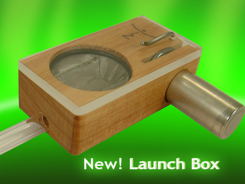 Die Launch Box besteht aus einem rechteckigen Holzblock mit einer kleinen Kammer für fein zerkleinerte Kräuter. Ein spezieller, unummantelter AA-Akku wird fest in die seitliche Öffnung gedrückt, wodurch ein elektrischer Kreislauf geschlossen wird. Der Strom fließt durch das Edelstahlsieb, das sofort als Heizelement dient und das Material in 3 bis 5 Sekunden direkt auf die Verdampfungstemperatur erhitzt. Gleichzeitig zieht man langsam am Glas-Mundstück und sieht, wie sich innerhalb von wenigen Sekunden Dampf bildet.
