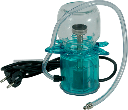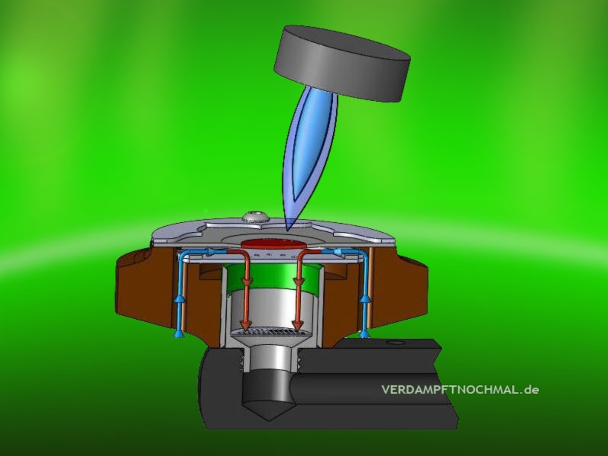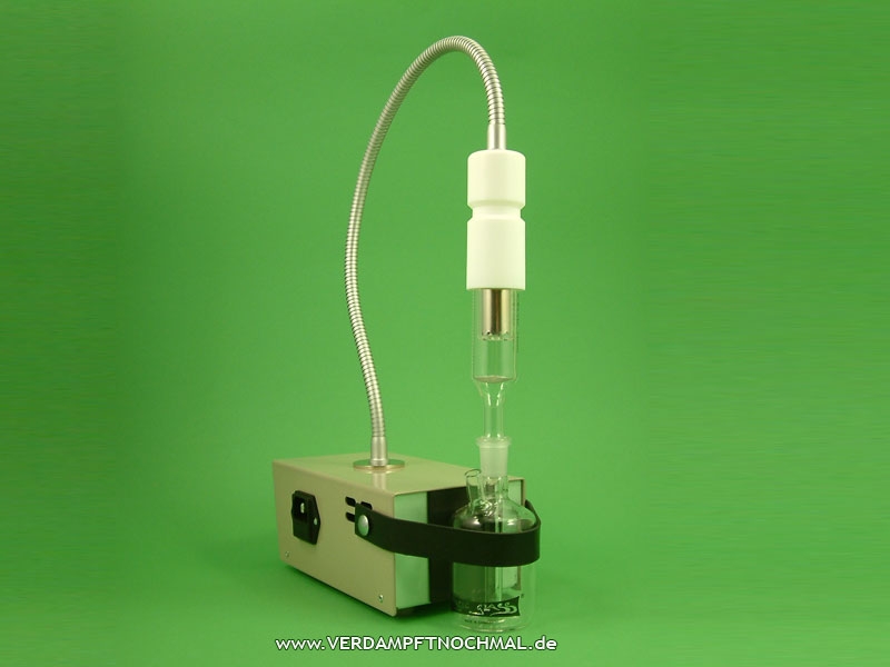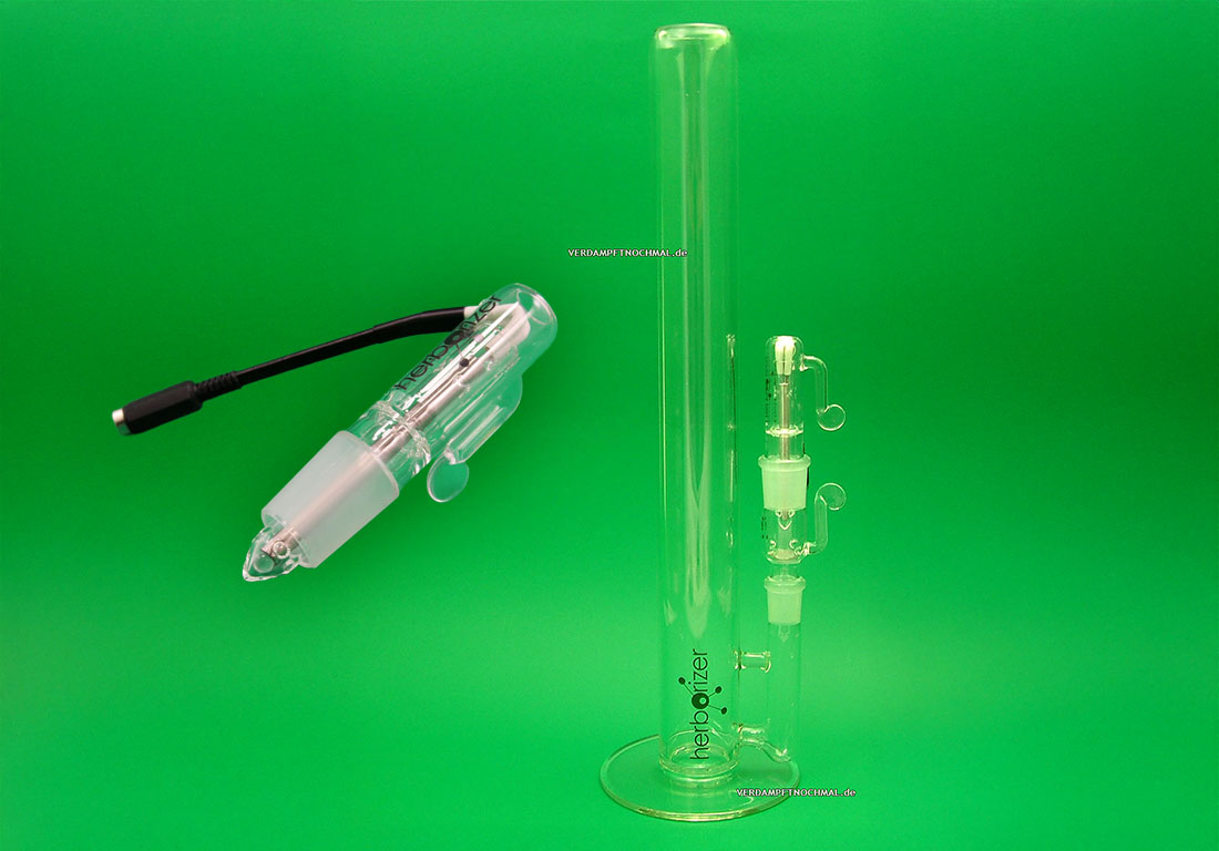 Ein elektrisches Heizelement sitzt dicht über der Glaskammer. Kräuter hinein, anschließen, Temperatur wählen, Heizelement aufsetzen. Beim Ziehen strömt sehr heiße Luft durch das Pflanzenmaterial, der entstehende Dampf wird durch Wasser sehr effektiv gekühlt. Ideale Anwendung: Langsam, mit gleichmäßigen Zügen inhalieren, um Dampfentwicklung und Kühlung zu maximieren.