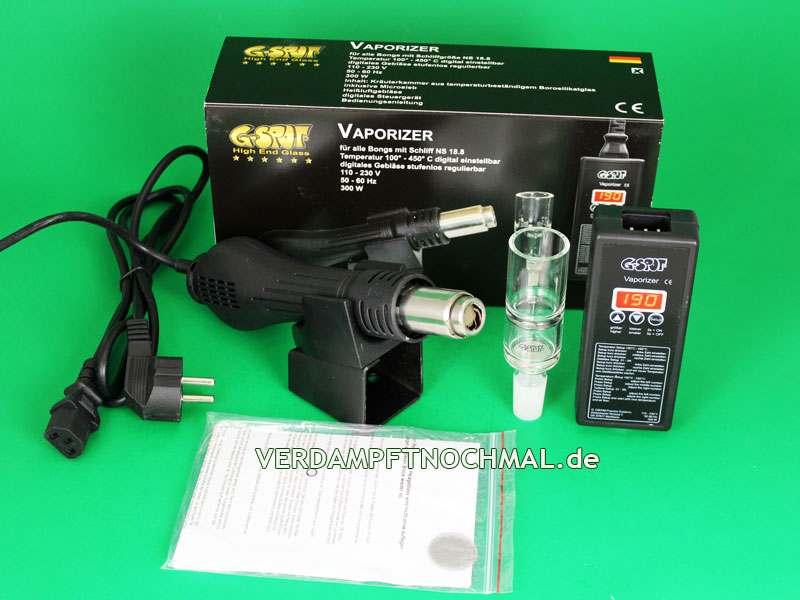 Der G-Spot Vaporizer kombiniert einen kleinen Heißluftföhn mit einem speziell angepassten Bong-Köpfchen. Das Gebläse sorgt dafür, dass die Aufheizzeit erheblich verkürzt wird.
