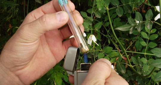 Das innere Glasröhrchen mit zerkleinerten Kräutern befüllen, das äußere mit Jetfeuerzeug gleichmäßig außen erhitzen. Die heiße Luft löst die Wirkstoffe beim Ziehen heraus. Glas sorgt für reine Dampfentwicklung.