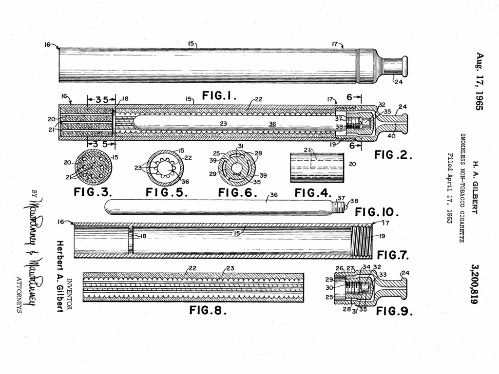 Der Sprung zum technischen Verdampfer gelang erst im 20. Jahrhundert. 1927 meldete der Amerikaner Joseph Robinson das erste Patent für eine „elektrische Zigarette“ an. Obwohl das Gerät nie vermarktet wurde, gilt Robinson als Pionier. In den 1960er-Jahren entwickelte Herbert A. Gilbert die erste rauchfreie E-Zigarette, deren Ziel war, Dampfinhalation zur gesundheitsschonenden Alternative zu machen. Eine Markteinführung fand aber erst Jahrzehnte später statt, die Technik war ihrer Zeit voraus.
