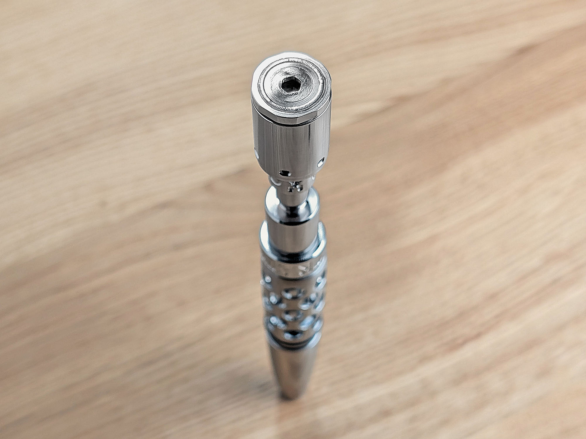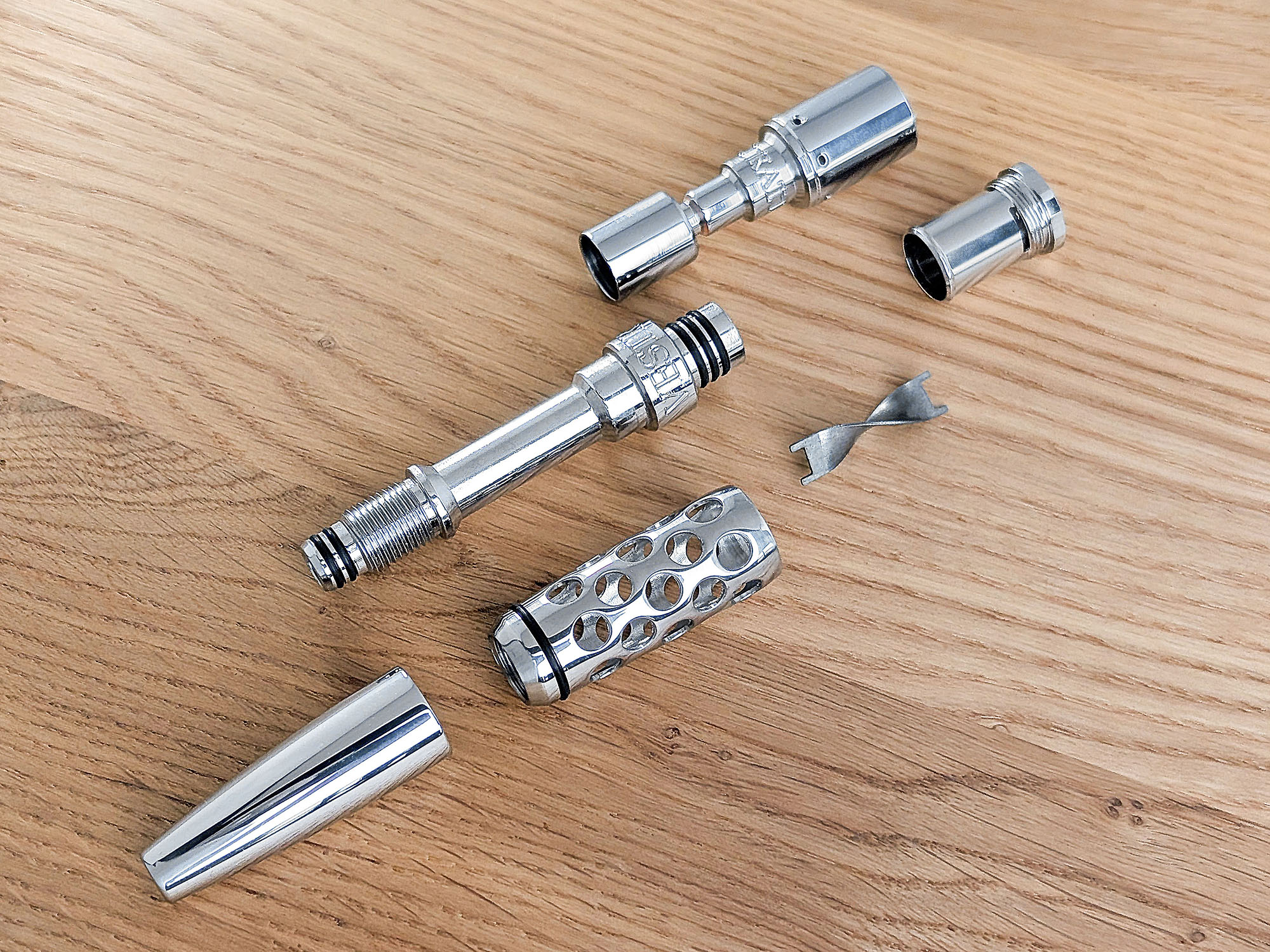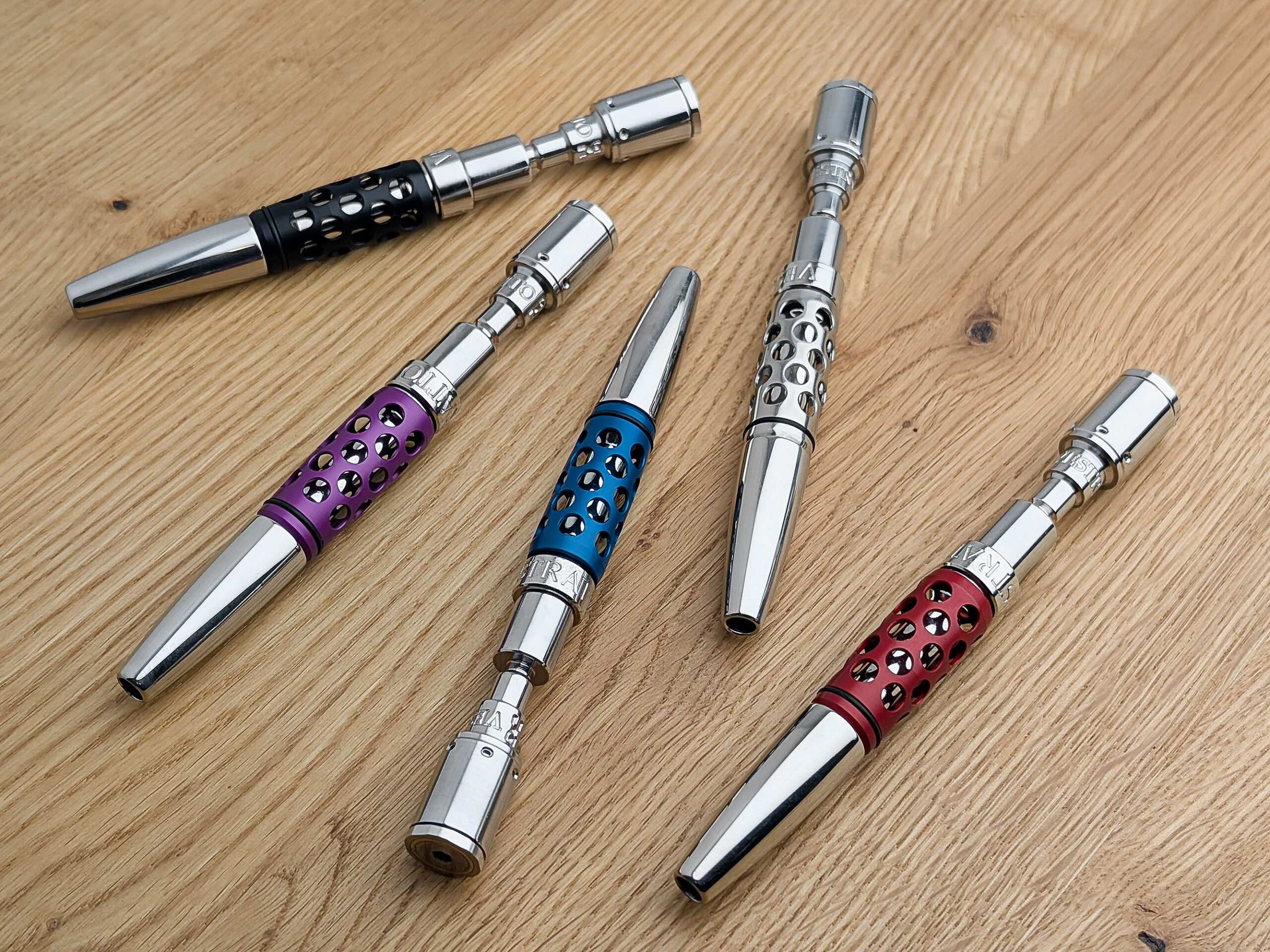 Technically, the Tornado is a TED – Thermal Extraction Device, a manual, portable vaporizer. At first glance, it feels massive and high-quality. Vestratto’s experience in manufacturing medical instruments is evident in every detail: the casing is made from precisely milled, medical-grade metal. Stable, durable, and visually more like a lab instrument than a lifestyle gadget. The clear, functional design emphasizes the focus: pure performance, no gimmicks.