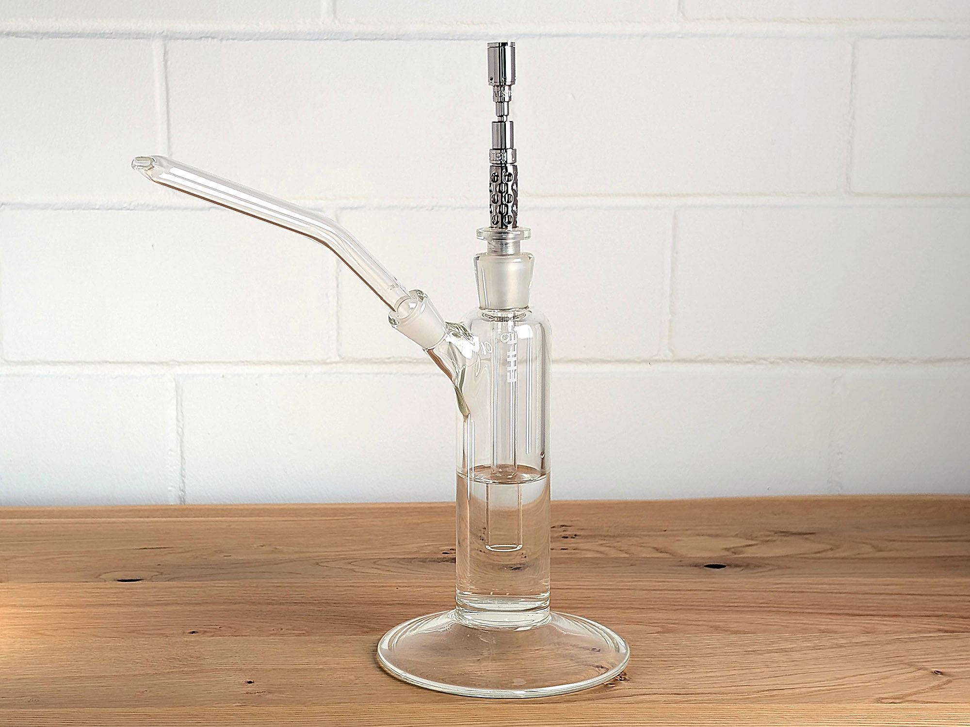 To use the Venty easily with a bong, you’ll need a water pipe adapter (WPA), either made of glass or silicone. Small to medium-sized bongs are ideal, as they optimize the draw and fully utilize the vaporizer’s potential: whether a mobile Side-Bubbler, a deBlub GTF V2 with hose for shisha-style vaping, or a luxurious all-in-one VapoVault.