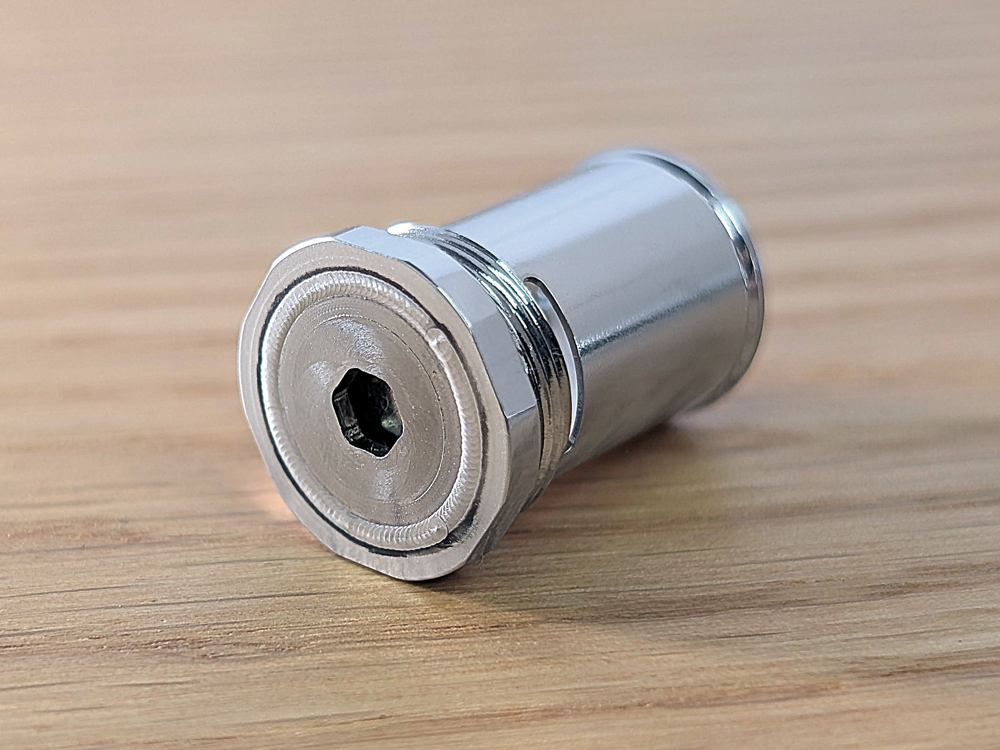 The device has a compact, cylindrical body with a hexagonal grip structure on the XXL herb chamber. This makes insertion, removal, and adjustment particularly easy while providing a secure hold. The herb chamber is generously sized and can hold about 0.3 g of material. It is directly attached to the included stainless-steel WPA and held firmly on any bong or water pipe with a 14.4 mm joint thanks to two inserted O-rings.