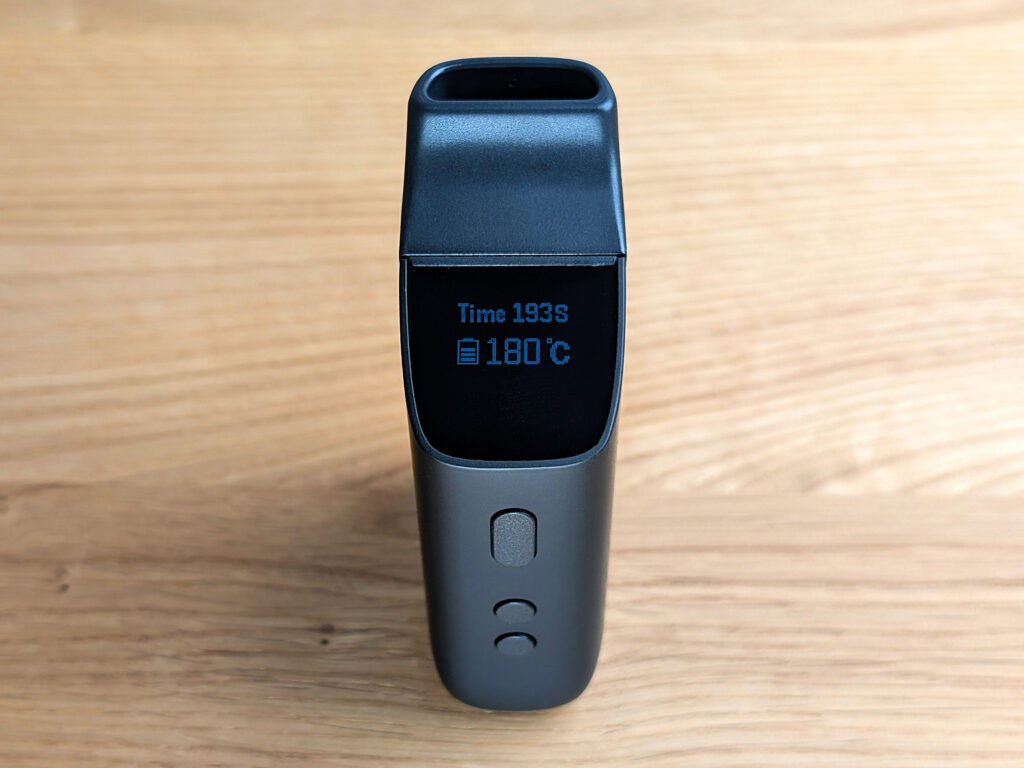 Temperature can be precisely set between 100 °C and 220 °C and is easily readable on the OLED display. The sturdy body feels comfortable in hand, while the magnetic mouthpiece allows for easy handling and quick cleaning.