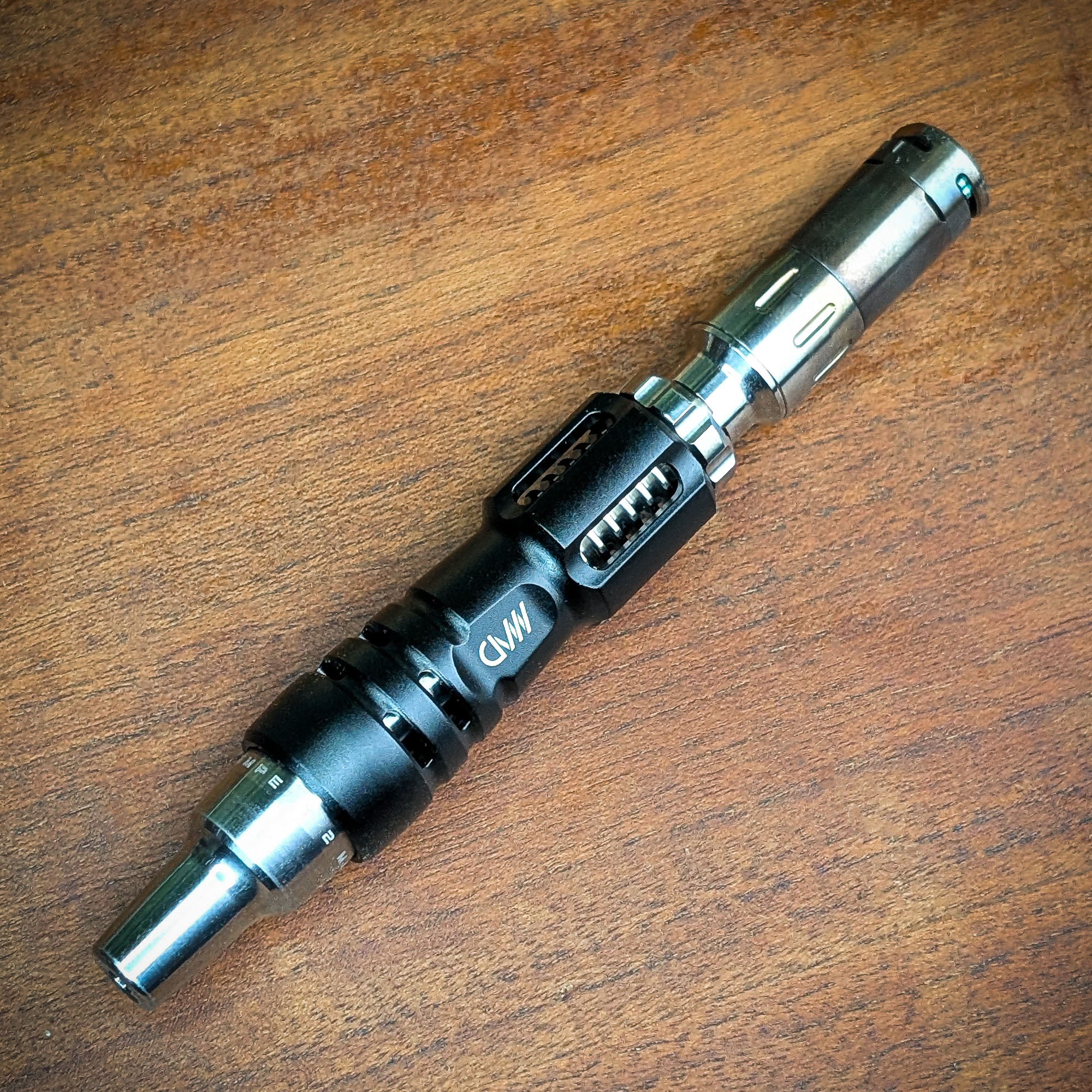 To do this, place the container with the tamper facing up on the table, place the CCD on top, and then push the Dynavap tip over it. The CCD clicks precisely into the notches of the bowl. Before this tool, I used to lose my mind trying to do this. With the Dynavap condenser trick, it took me nerve-wracking ages.