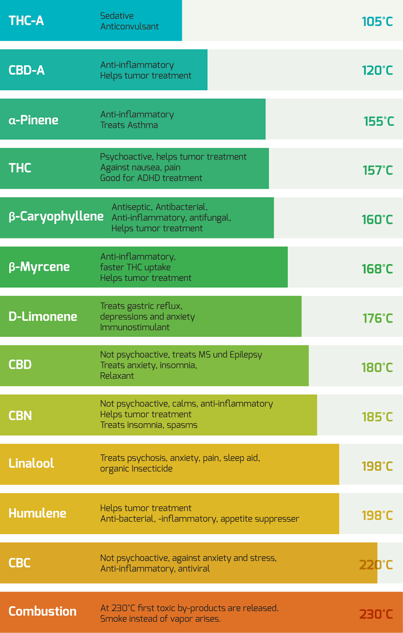We have compiled an overview of the specific boiling points of the most important cannabinoids (data from Steep Hill Labs). THC and CBD are just a significant part of this mix. If you only know these two compounds, this table provides a practical overview: